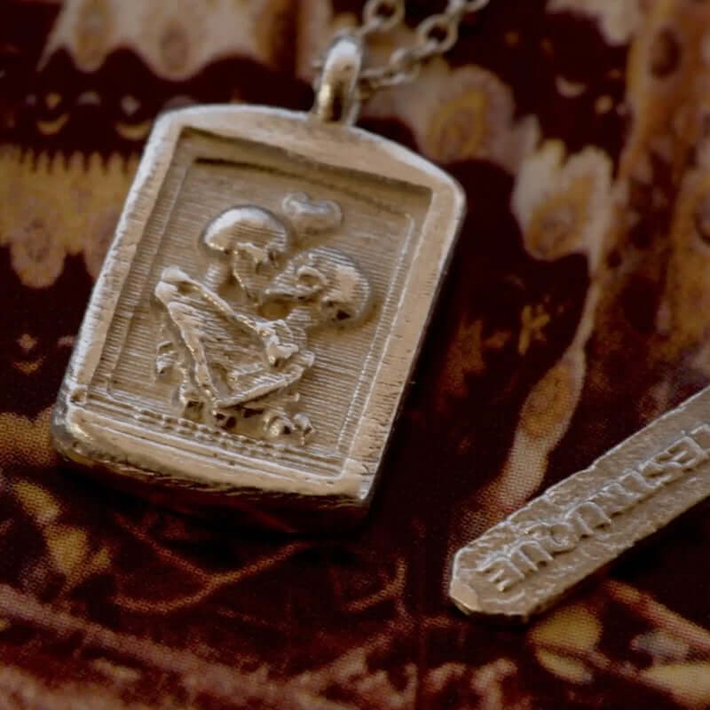This unique piece features an etched skull couple intertwined with a heart, representing everlasting love and unity beyond time. The design is beautifully framed within a square, tarot card-inspired shape, evoking a sense of mysticism and fate. It represents love, mortality, and the infinite cycle of existence.