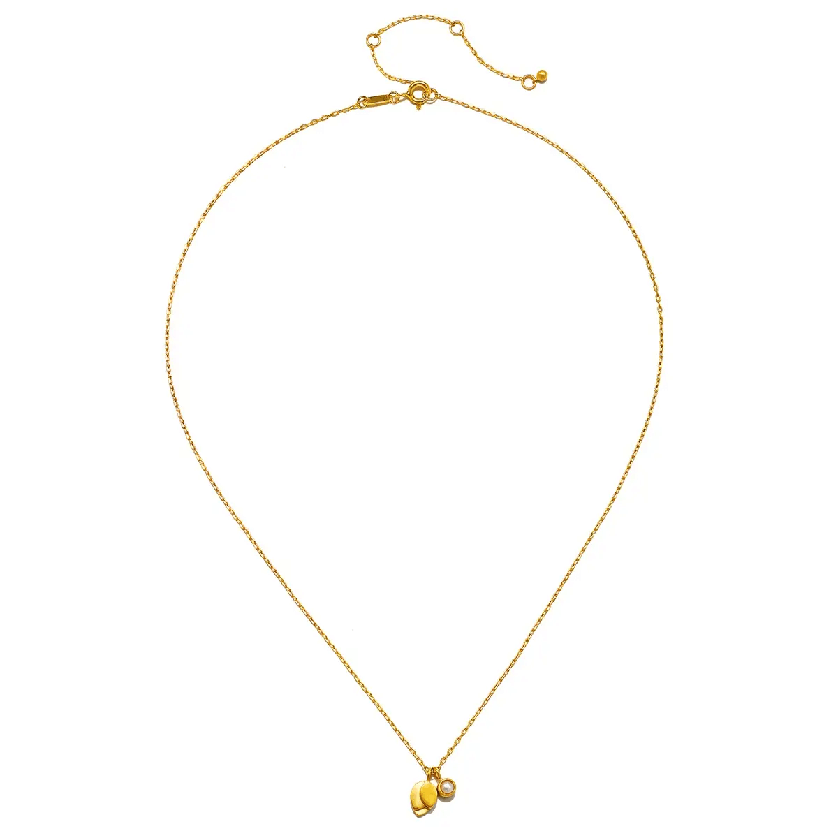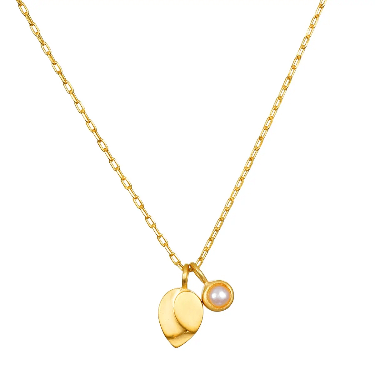 • Material: 18k gold plate over brass • Stone: 3mm smooth round cabochon pearl • Pendant size: 6 x 8.5mm • Necklace length: 18" with 3" extender for adjustable fit