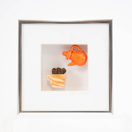 6x6 Shadowbox with an Orange Teapot Pouring into a Cream Coffee Mug in a Silver Frame