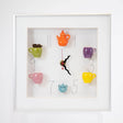 10x10 Clock with an Orange Teapot, Light Blue Sugar Jar, and Wavy Hands in a Silver Frame