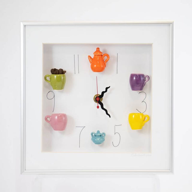 Meet a tiny work of art you can hang or display anywhere. This 10x10 clock features a navy teapot and a red sugar jar set inside a warm gold frame, all hand-tooled by Carlos Silva. No molds here—each teapot, mug, and piece of dinnerware is one-of-a-kind and tiny enough to delight the eye. The clock measures about 10 inches square and 1.5 inches deep and runs on a single AA battery, so you can pop in a fresh battery and you're good to go. It's more than a clock—it's a conversation starter and a cheerful reminder of cozy tea moments.