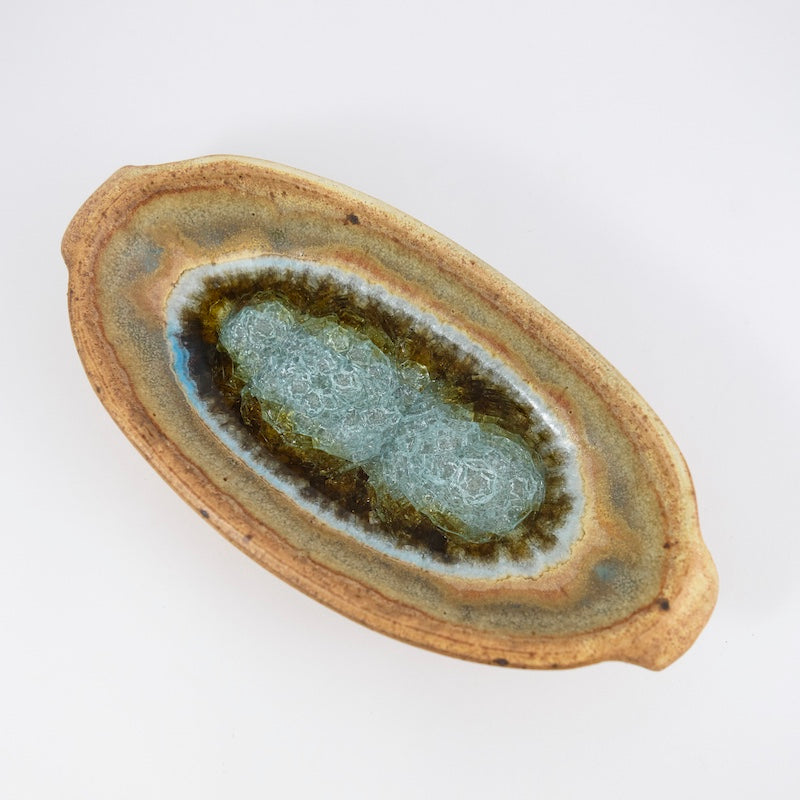These butter dishes are wheel-thrown from sustainable stoneware clay, reflecting the beauty of small-batch handmade pottery. Each dish is one-of-a-kind, featuring fused glass that highlight textures inspired by geodes and natural gemstones.