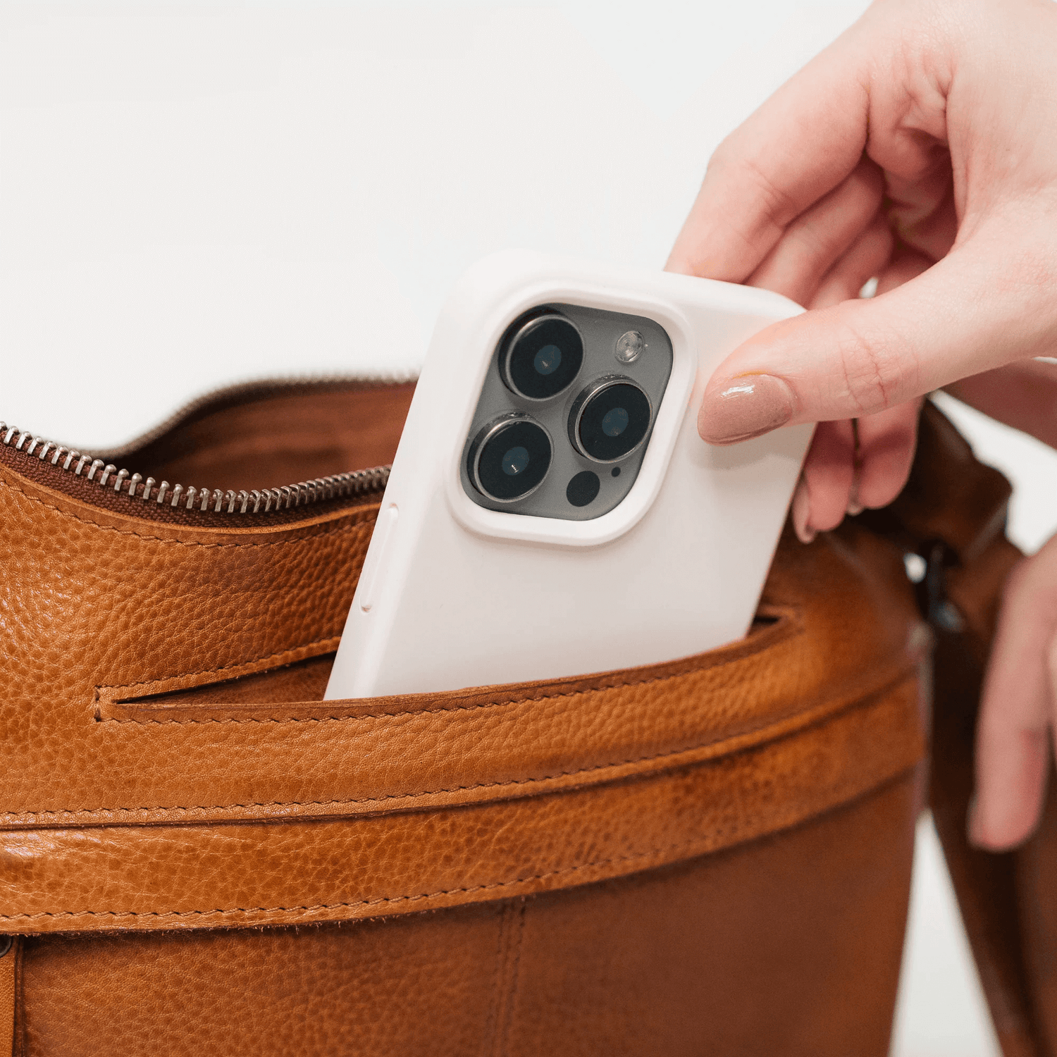 • Exterior details include a front open pocket, a back zip pocket, and an additional open pocket secured with a hidden magnetic snap—perfect for items you need at arm’s reach.