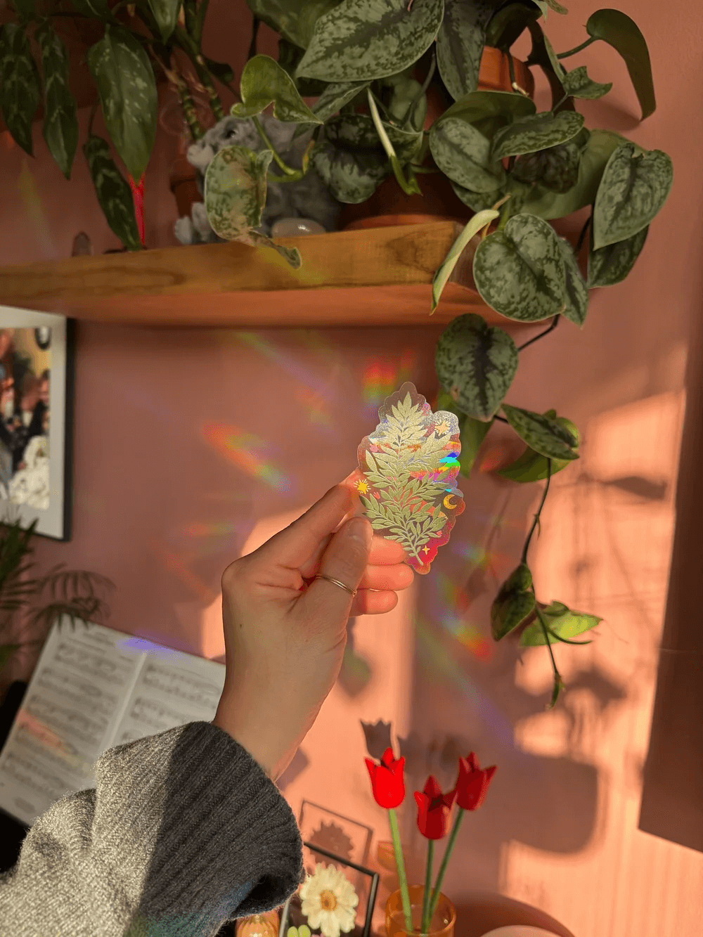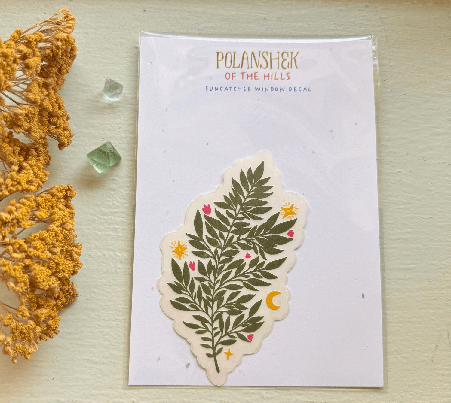 This is a removable suncatcher window decal! Apply to a clean glass window that gets plenty of direct sunlight for optimal rainbow magic. It’s 4” tall and features a little fern drawing by Vermont artist Jess Polanshek.
