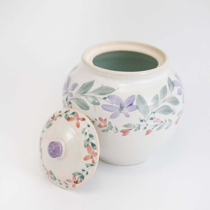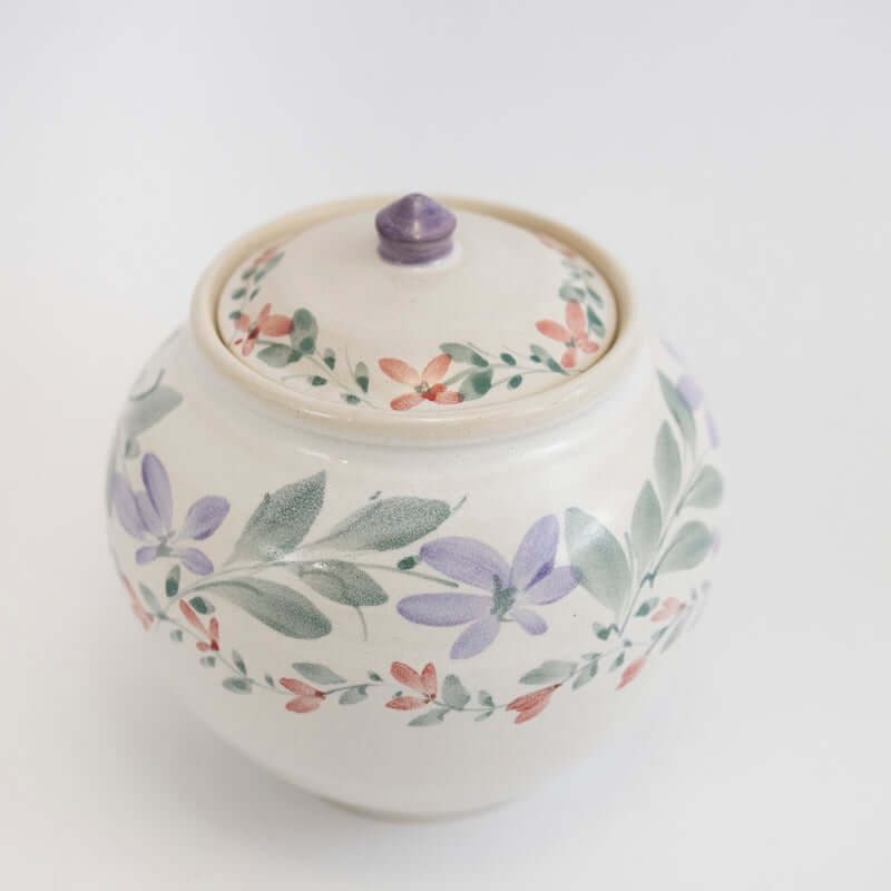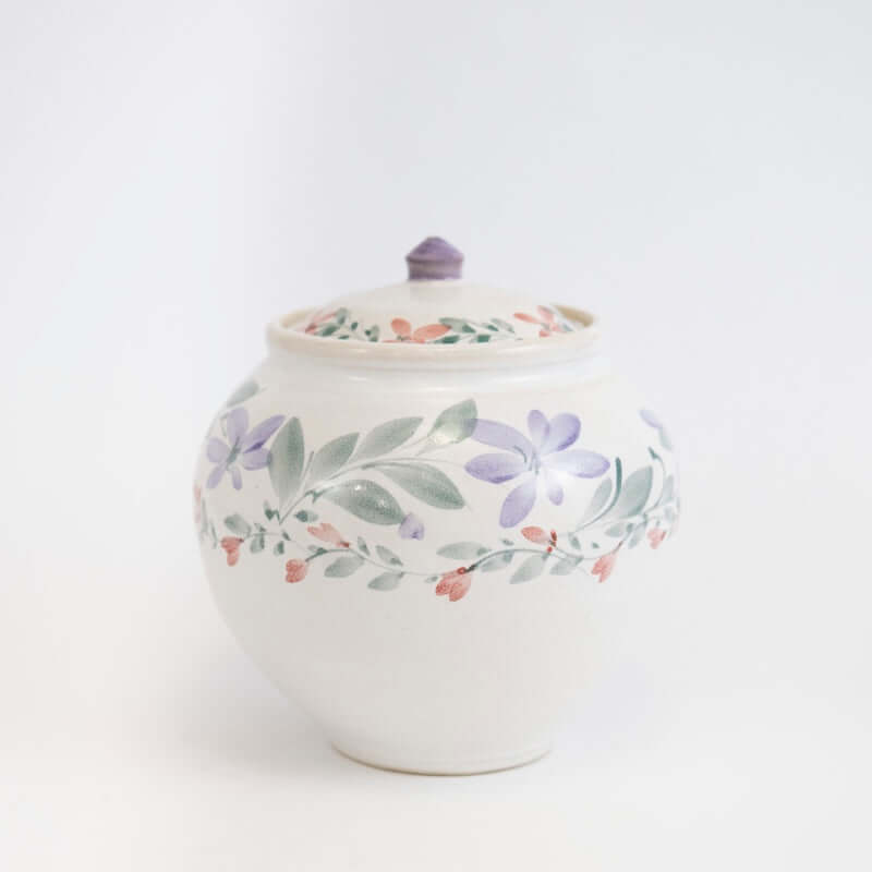 One-of-a-kind covered jar with purple and red flowers on porcelain clay by Megan Hart of Conway, MA.