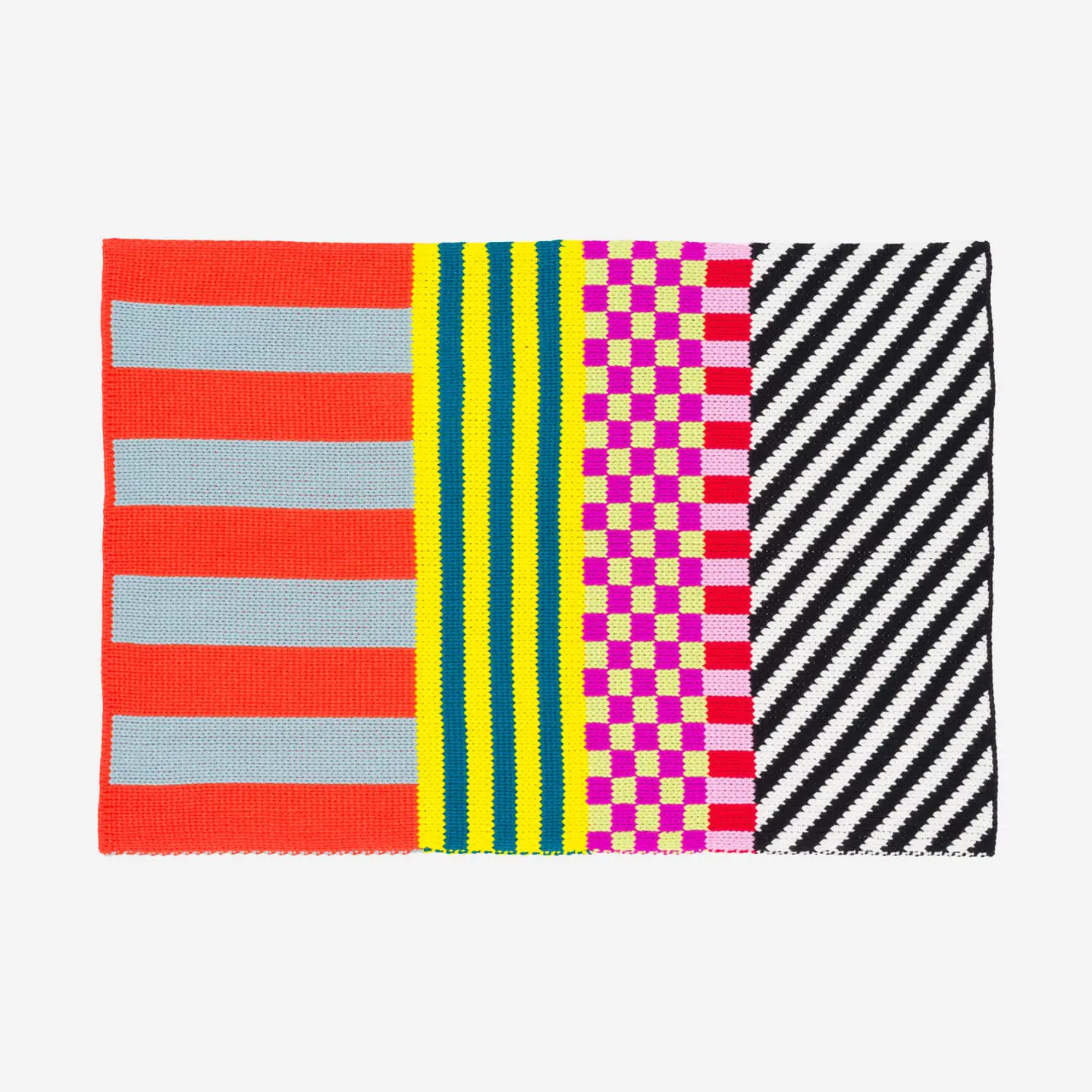 Two-tone knit mini rug with bold patchwork patterning. Add a pop of color and pattern to your entryway, kitchen, bathroom, or bedside!