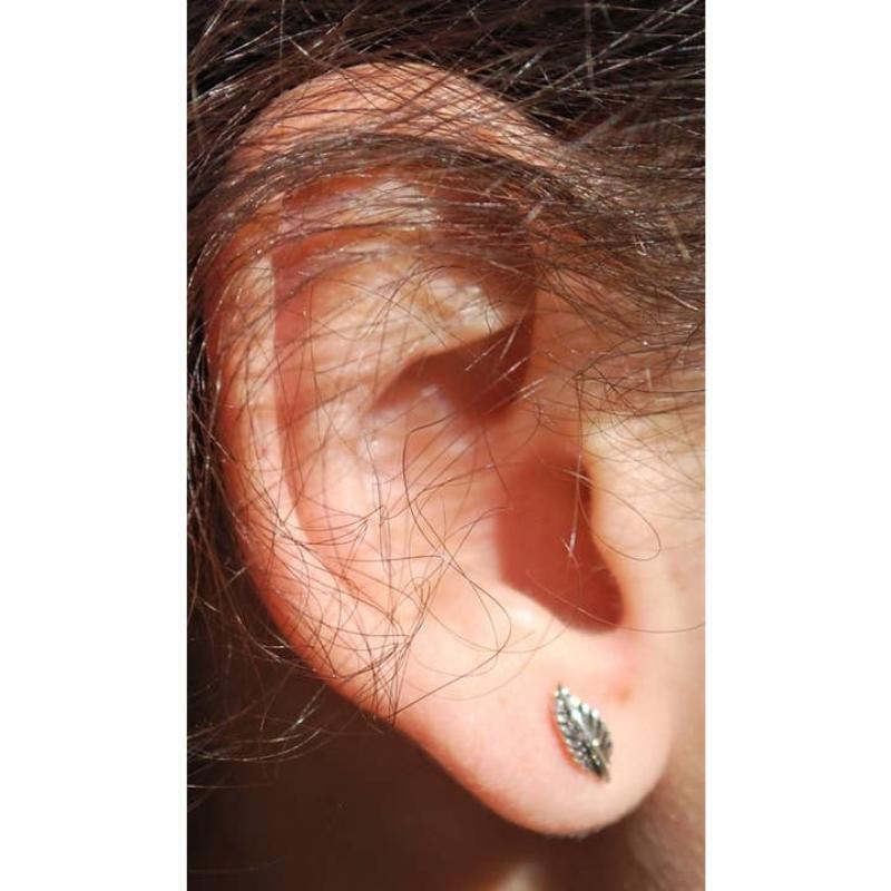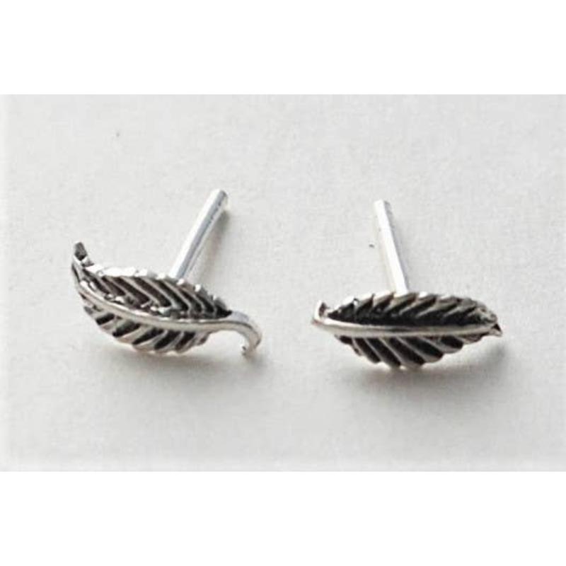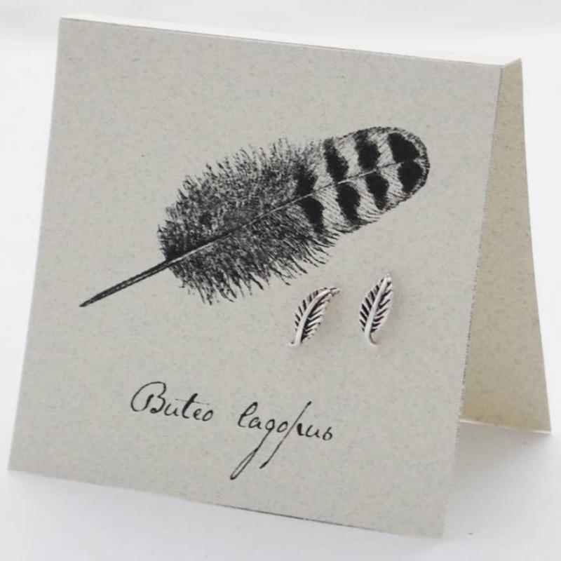 Feather sterling silver stud earrings are mounted on a Natural History tent card. Educational message about birds of prey on back of card.