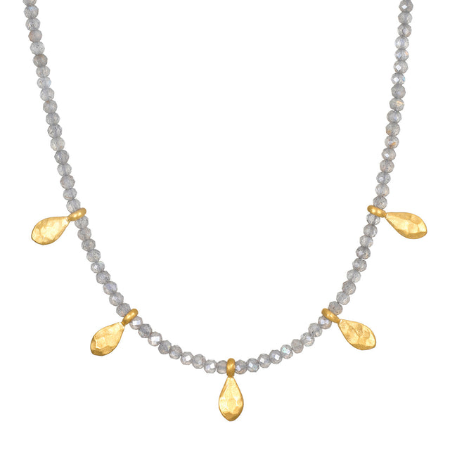 Our new beginning has arrived; may the inspiration that brought you to this moment carry you through this powerful transformation. Beads of labradorite, stone of intuition and implementing thoughts into action, shines with 18kt gold plate lotus petals, signifying new beginnings and full potential.