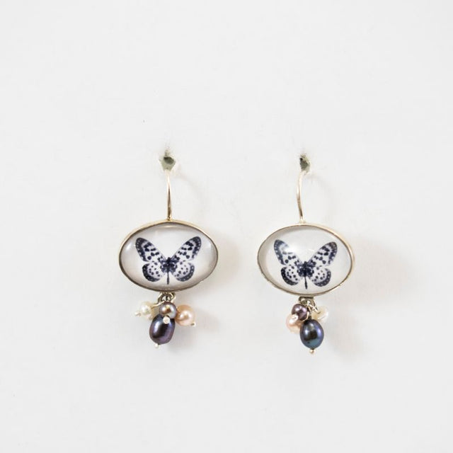 Photograph of a butterfly in a sterling silver frame, encased in glass, with a cluster of pearls.