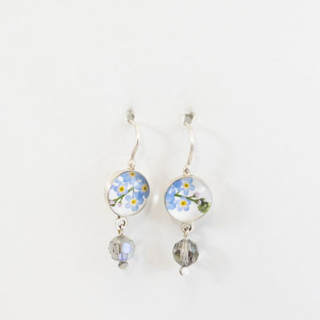 Photograph of a forget me not flower in a sterling silver frame, encased in glass, with beads.