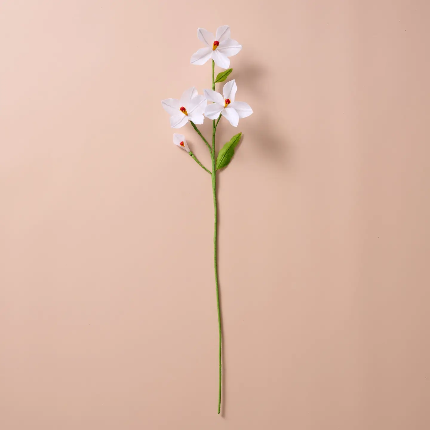 Add a fresh and natural touch to any space with these gorgeous silk paperwhite flowers. Each jute wrapped-wire stem features three paperwhite flowers, one bud, and a leaf. The white flowers with red and yellow centers add a classic aesthetic and are ready to be styled.