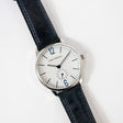 La colección de correas de reloj Grant presenta cuero italiano grueso jaspeado con costuras monocromáticas y presillas de cierre, compensadas por una hebilla de acero inoxidable con acabado de alto brillo para una elección elegante.