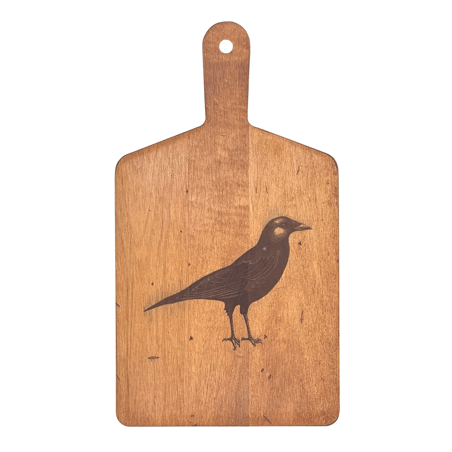 A maple rectangle handled cheese board with an antique distressed finish. The engraved artwork is from Vermont Artist Laura Zindel of a Crow. The board is sized to serve a single style of cheese for 1-4 people or as a great bar board.