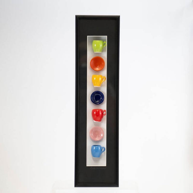 4x16 Vertical Shadowbox with Multicolor Mugs and Plates and Black Matte in a Black Frame