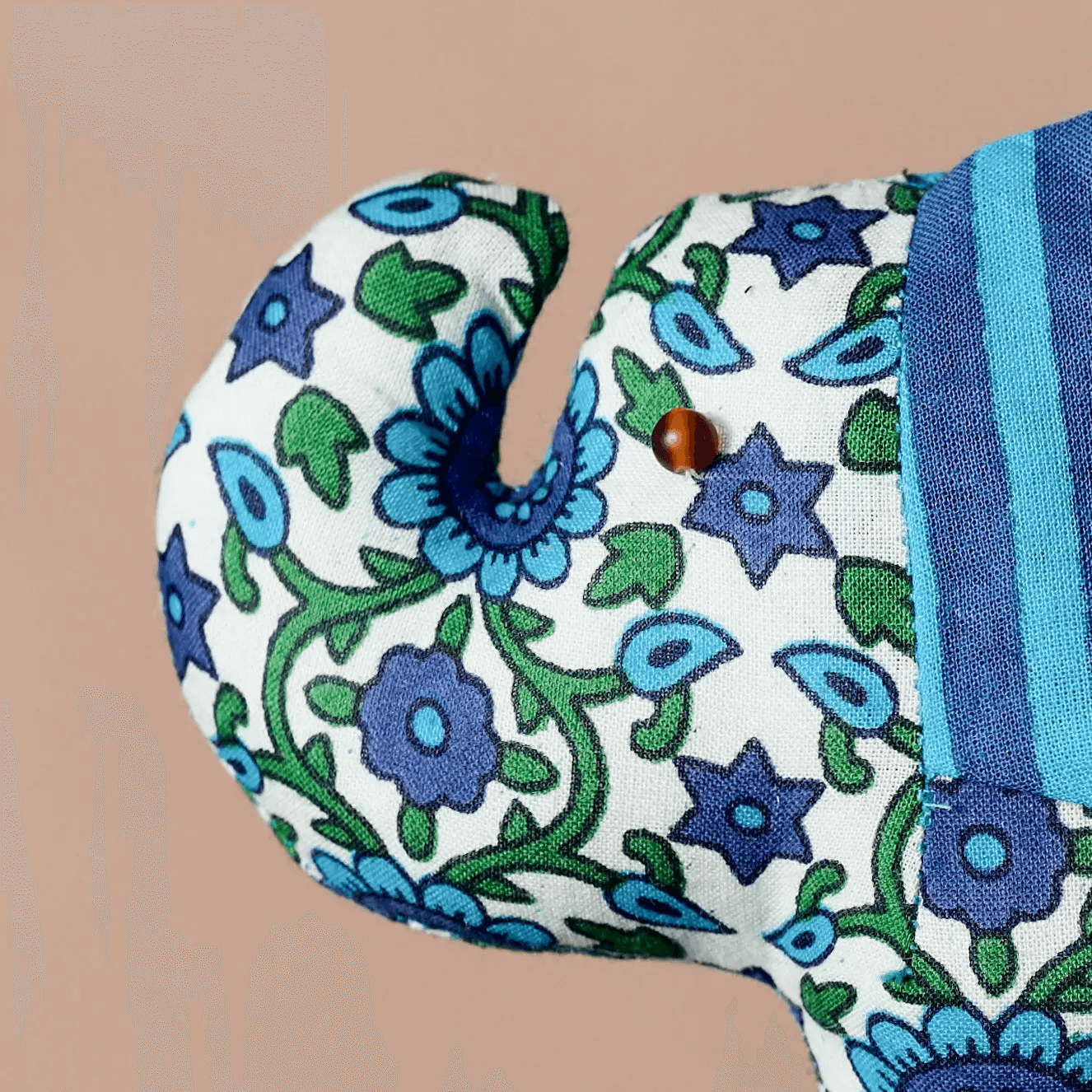 Bring charm and color to your tree or gift wrap with this delightful, handcrafted ornament. Made from vibrant cotton fabric in blue, white and green patterns, this petite pachyderm features bead eyes, stitched details and a playful braided tail.