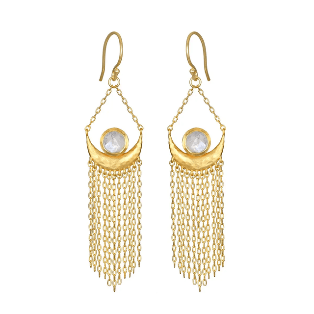 These 18 Karat gold-plated earrings are graced with a crescent moon, symbol of nourishment, protection, and goddess energy. A moonstone star ignites dreams and offers hope, feminine energy and wisdom. Delicate golden chains cascade from the moon, creating shimmering movement. Wear these earrings to remind you of your inner goddess, and to inspire you to share your radiance with the world.